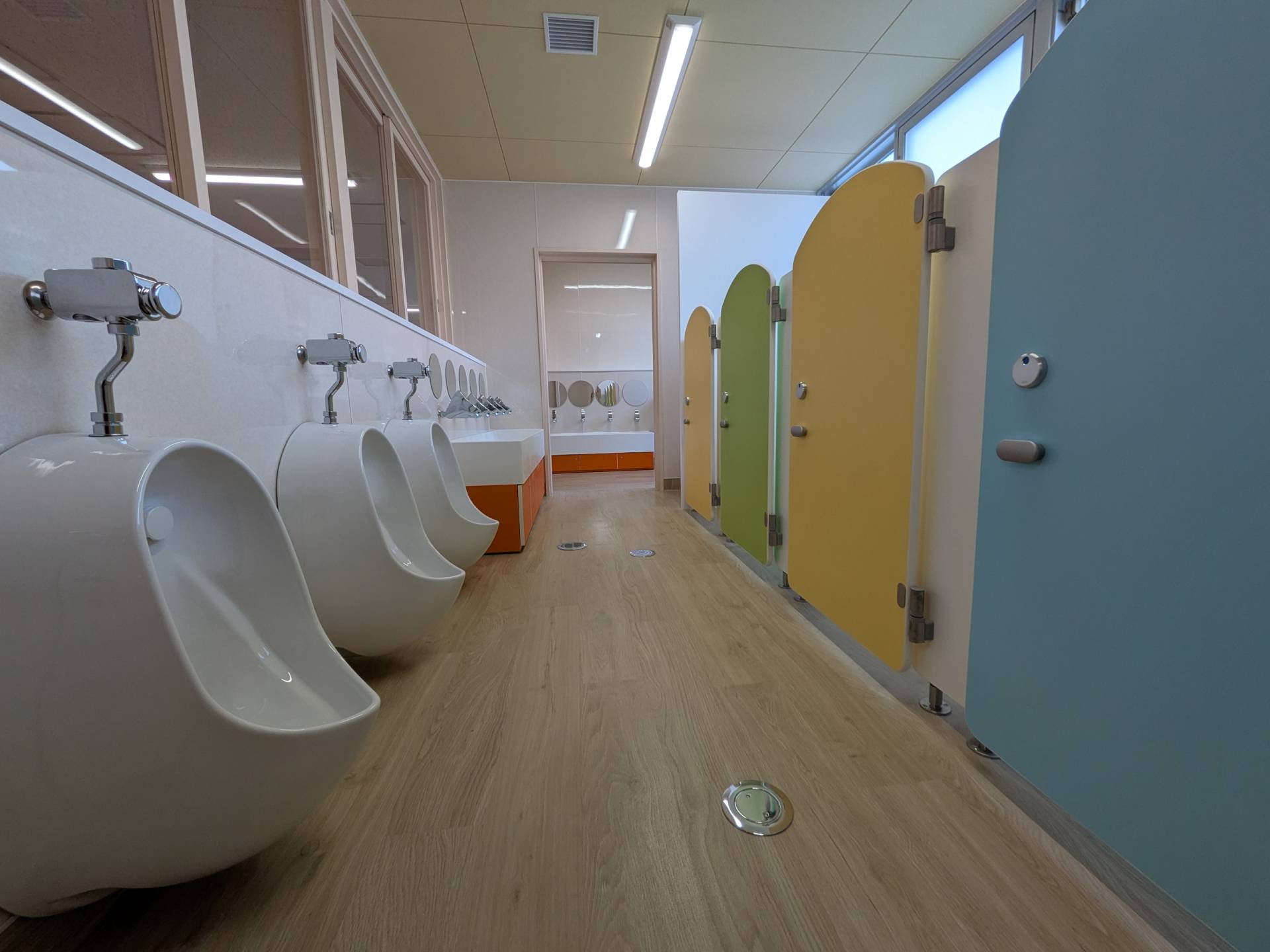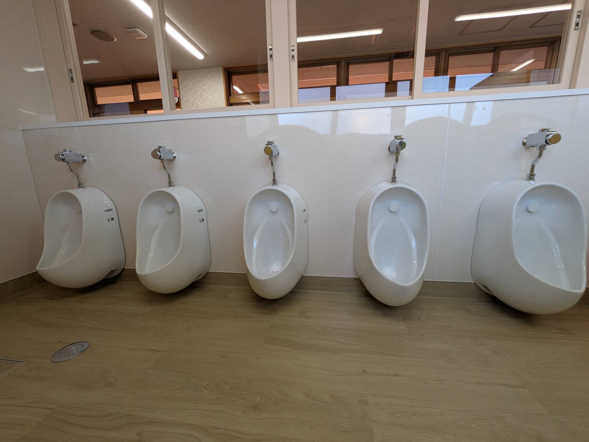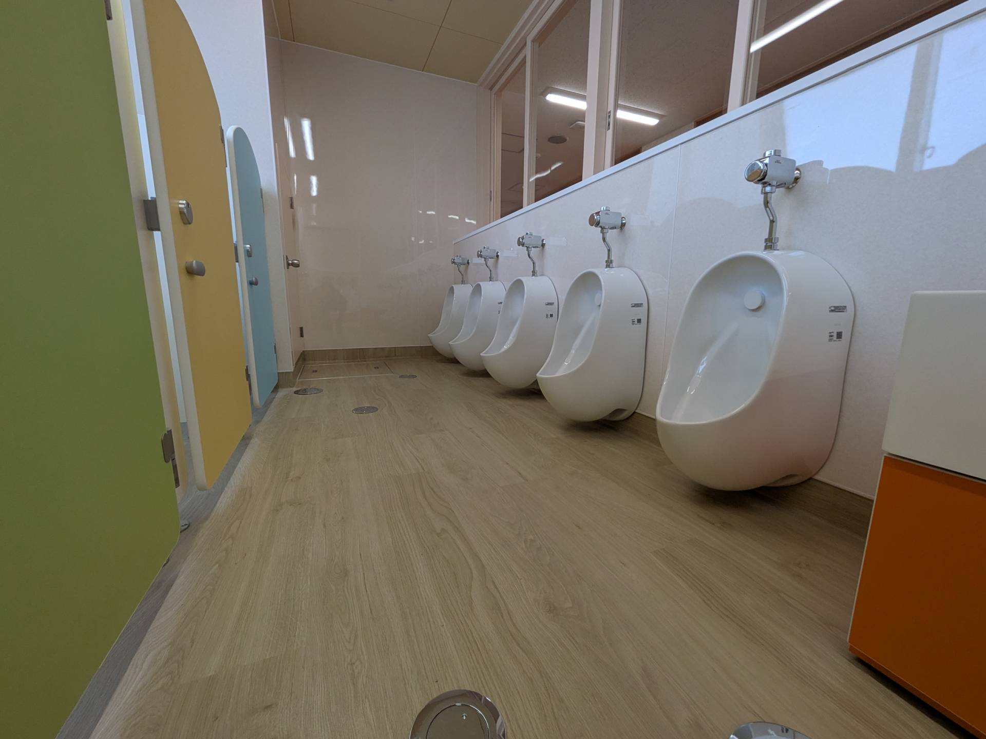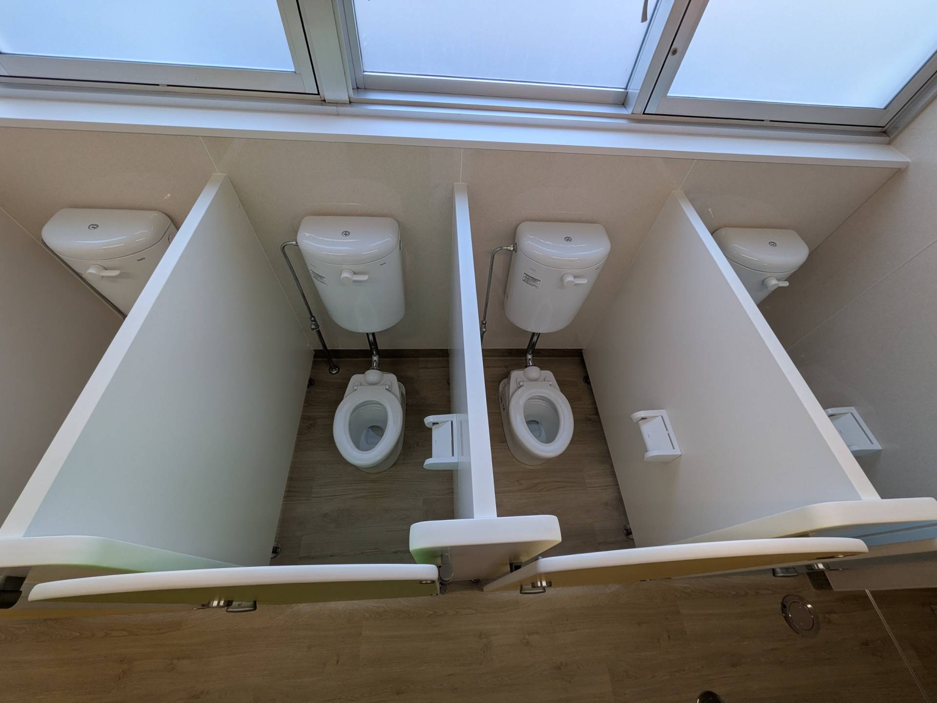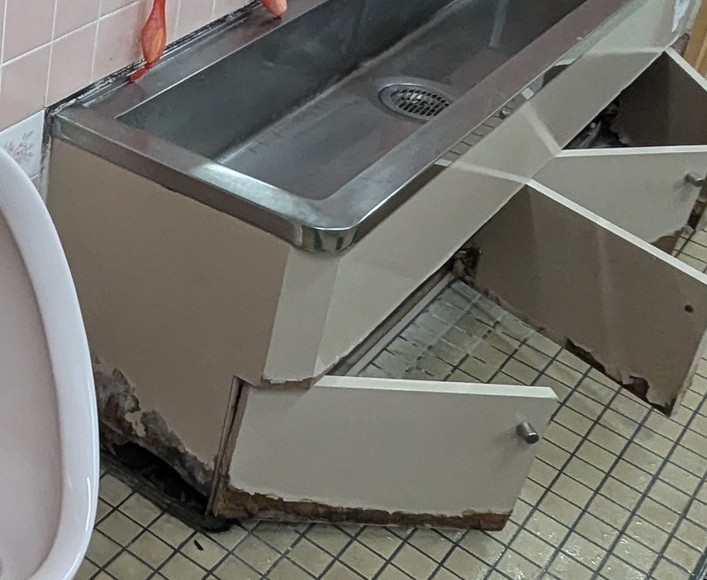 中央に排水溝があり水切れが早い反面、溝に溜まった水は乾きが遅いのでトイレ全体に滞留する湿気によりトイレブースや手洗い器などの腐食が気になるところでした。